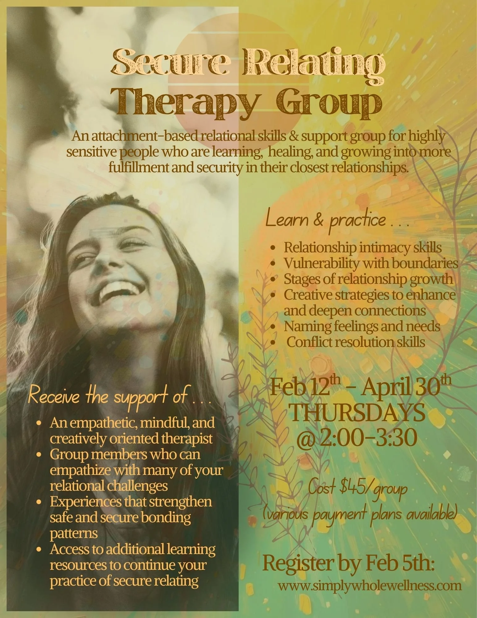 Thanks for expressing interest in the upcoming Secure Relating group! Please follow the registration instructions below. When I receive your confirmation email with payment preferences and your first payment for the group, you will be officially registered. I look forward to seeing you on February 12th for our first session :)